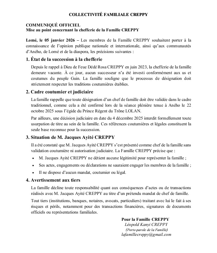 Au Togo, la Famille CREPPY est sortie de son silence pour clarifier la situation autour de sa chefferie, restée vacante depuis le décès de Dédé Rosa CREPPY en juin 2023. Dans un communiqué rendu public le 5 janvier 2026 à Lomé, la collectivité familiale affirme qu’aucun chef n’a, à ce jour, été désigné conformément aux us et coutumes du peuple Guin.