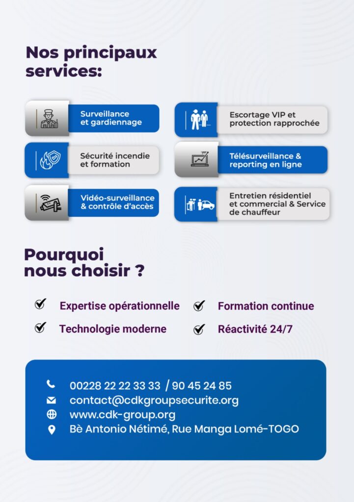 Dans une dynamique de croissance et de professionnalisation du secteur de la sécurité privée au Togo, CDK GROUP SÉCURITÉ annonce le renforcement de ses équipes à travers une vaste campagne de recrutement d’agents de sécurité sur toute l’étendue du territoire national. L’entreprise met un accent particulier sur certaines zones stratégiques et encourage fortement les candidatures féminines, affirmant ainsi son engagement en faveur de l’inclusion et de la promotion du genre dans un domaine longtemps dominé par les hommes.