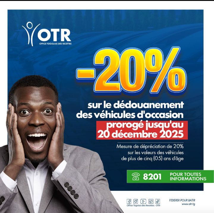 Initialement prévue pour prendre fin le 15 novembre, l’Office Togolais des Recettes (OTR) annonce la prorogation de la dépréciation de 20 % sur la valeur en douane des véhicules de plus de cinq (05) ans d’âge, désormais étendue jusqu’au 20 décembre 2025.