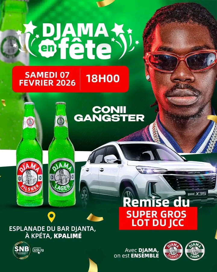 La ville de Kpalimé va vivre un moment exceptionnel placé sous le signe de la fête, de l’émotion et du partage par la Société Nouvelle de Boissons (SNB). Ce samedi 07 février 2026 à partir de 18h, la ville accueillera DJAMA à l’occasion de la grande remise du Super Gros Lot du Jeu Capsules Consommateurs (JCC), un événement très attendu par les consommateurs et les amateurs d’animations grand public.