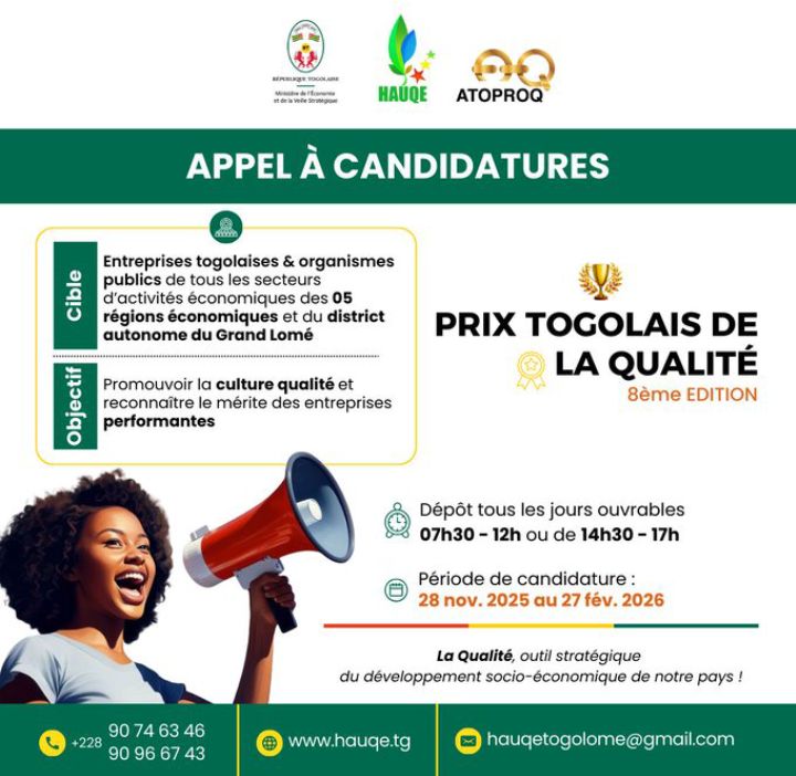 Les candidatures sont officiellement ouvertes pour la 8ᵉ édition du Prix Togolais de la Qualité (PTQ), une distinction nationale qui met à l’honneur les entreprises et organismes publics engagés dans l’excellence de leurs pratiques de management.