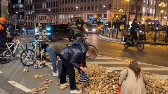 Sur des axes routiers de la capitale de la Belgique le week-end du 13 décembre 2025, des habitants ont été vus en train de ramasser des pommes de terre sur le bord des routes, après que des agriculteurs ont déversé des bennes entières de tubercules en guise d’action coup de poing.
