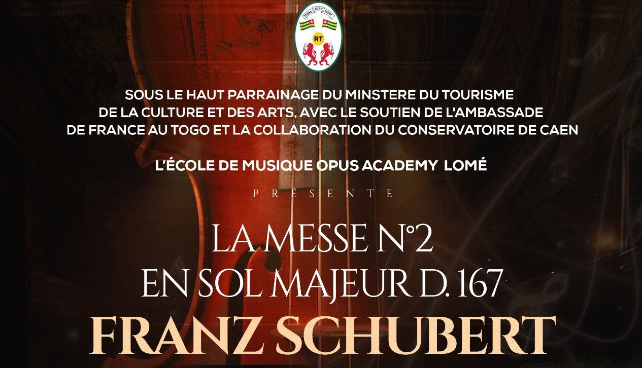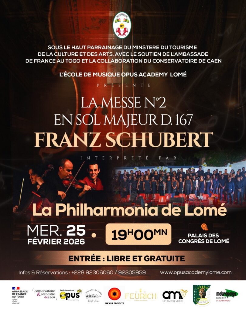 Lomé s’apprête à vibrer au rythme de la grande musique classique. La capitale togolaise accueillera cet événement événement musical d’exception avec l’interprétation de la Messe n°2 en Sol majeur D.167 de Franz Schubert par la Philharmonia de Lomé. Le rendez-vous est fixé au mercredi 25 février 2026, à partir de 19h00 précises, dans le cadre prestigieux du Palais des Congrès de Lomé.