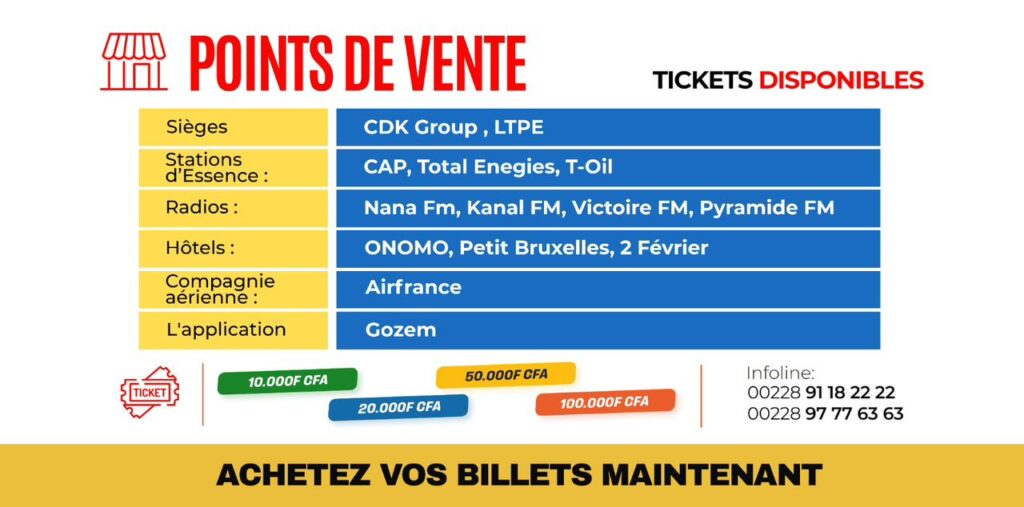 Achetez votre ticket et faites la différence. Informations et réservations : wa.me/00228 91 18 22 22