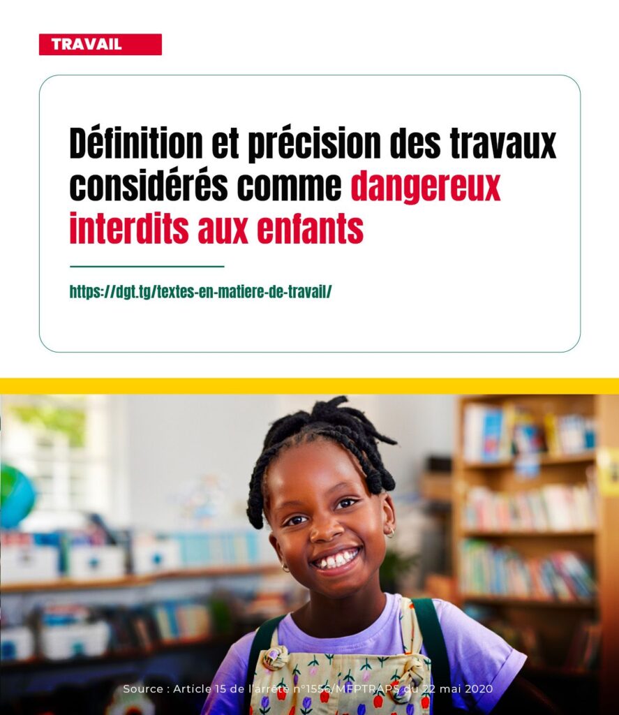 Adopté en mai 2020, l’arrêté précise les catégories de travaux considérés comme dangereux pour les enfants, renforçant ainsi le cadre législatif déjà en place au Togo. Il s’inscrit dans la continuité du Code du Travail, du Code de l’Enfant et des engagements pris dans le cadre de la Convention 138 de l’Organisation Internationale du Travail (OIT).