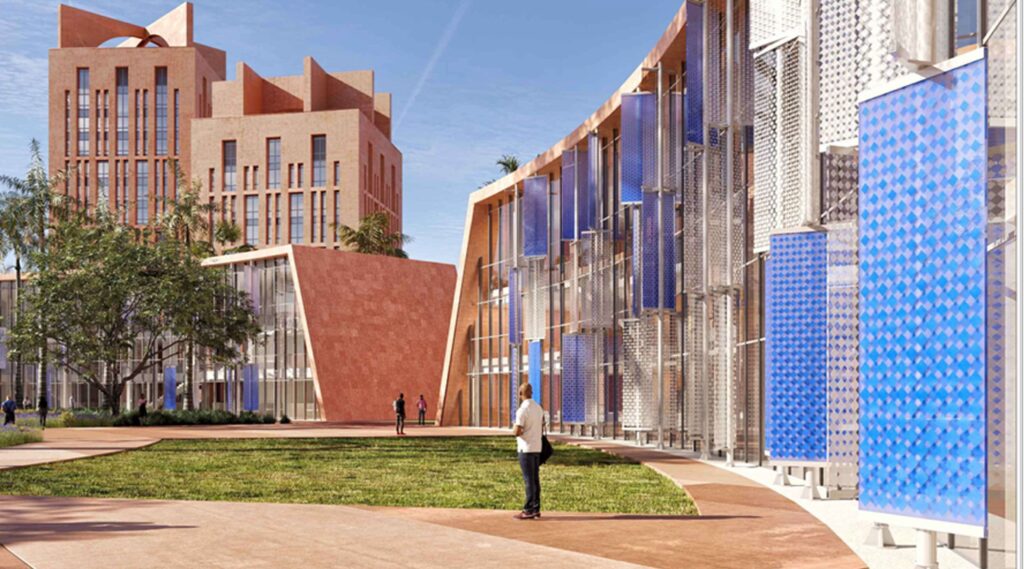 Véritable citadelle administrative, le projet s’organise autour d’un vaste jardin central et comprend 18 bâtiments réunis dans une enceinte unifiée. Cette configuration allie sécurité, cohérence architecturale et qualité des espaces de vie. L’ensemble repose sur une alternance harmonieuse entre huit tours de hauteur variable et dix bâtiments bas de deux à trois étages, renforçant l’échelle humaine du site. Les espaces de travail, modulables et évolutifs, pourront s’adapter aux besoins des administrations, tandis que les cabinets ministériels occuperont chacun deux niveaux.